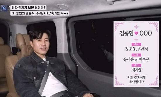 김종민은 올해 초 '서치미'에 출연해 강호동과 유재석에게 축사를 맡기고 싶다는 바람을 전했다. 연예계를 대표하는 두 MC를 축사자로 지목한 것이다.