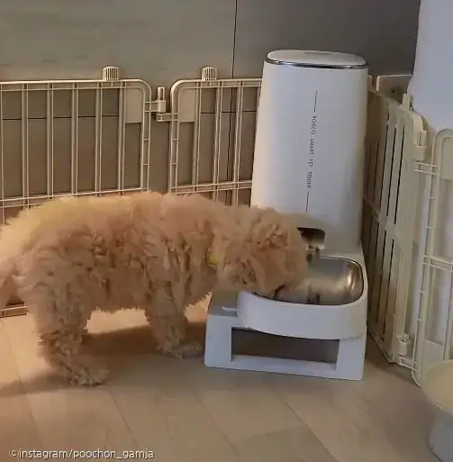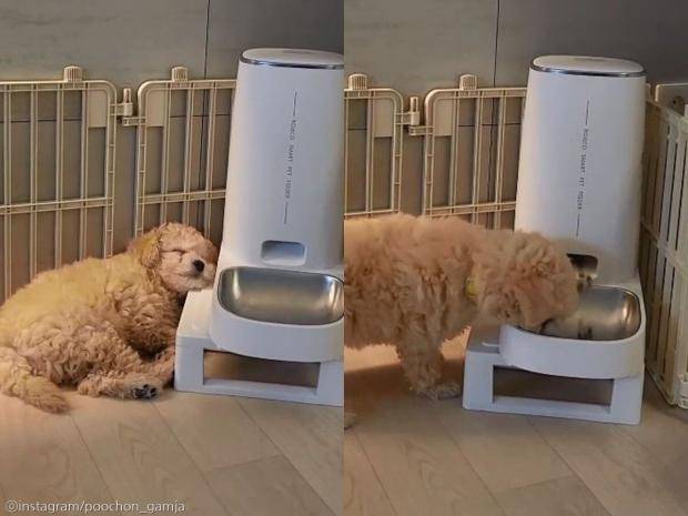 요즘 반려동물 키우는 집이라면 한번쯤은 고민해봤을 자동 급식기. 그런데 이 귀여운 강아지는 자동 급식기 바로 옆이 가장 편한 잠자리라고 생각했나 봐요.