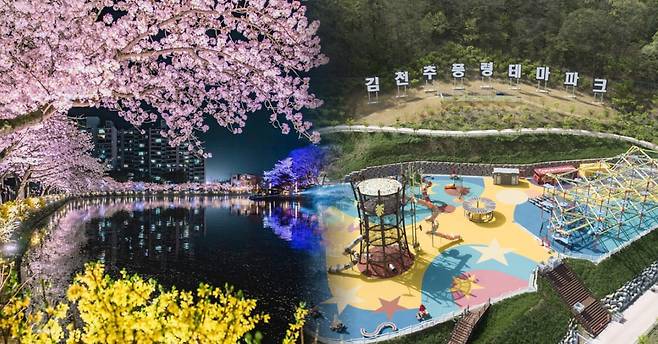 공원 내 족욕체험 시설이 있어 여행 중 피로를 풀기에도 좋은데요. 김밥을 포장해와 피크닉을 즐기기 좋은 잔디밭과 산책로가 잘 조성되어 있습니다. 매년 봄이 되면 형형색색의 봄꽃들이 만발해 더욱 아름답고, 인근 직지사와 연계해 관광하기에도 좋죠.