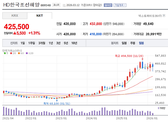 오늘(3/12) 종가는 425,500원. 52주 저점 181,300원에서 두 배 이상 올랐고, 52주 고점은 494,500원이다.