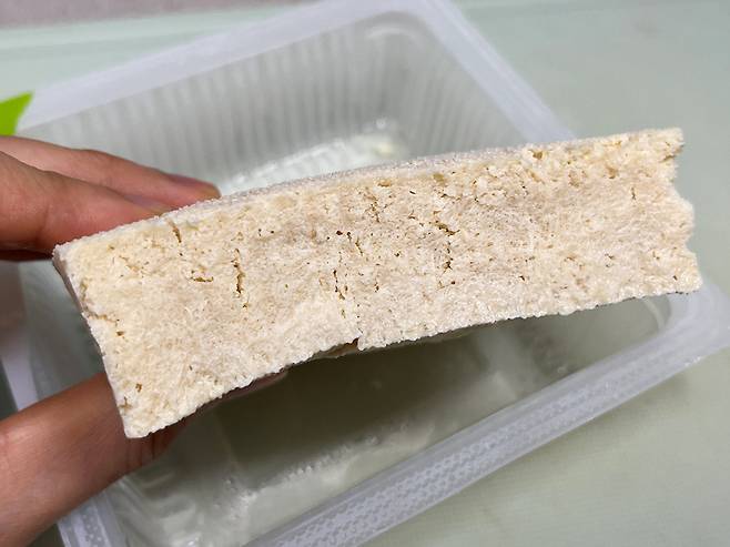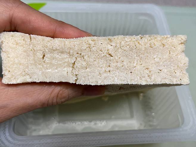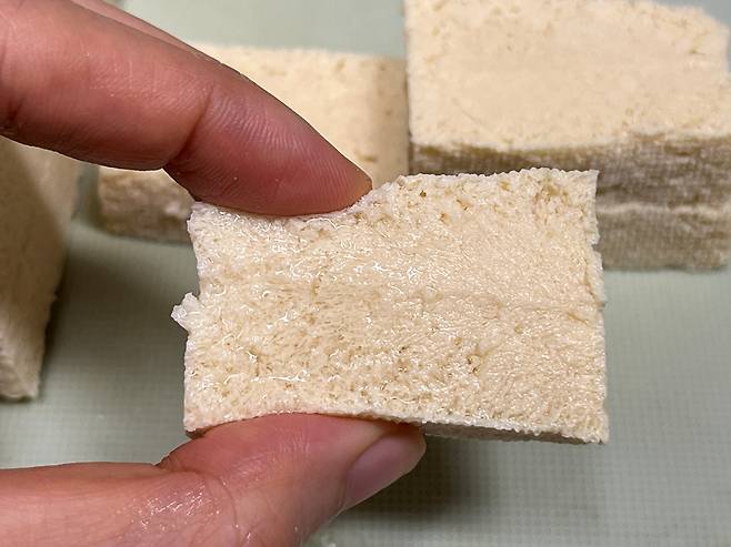 두부가 어는 과정에서 수분이 빠져나가 스펀지처럼 구멍이 생깁니다. 또한 부드러운 질감에서 약간 뻣뻣하고 쫄깃한 질감으로 변합니다.