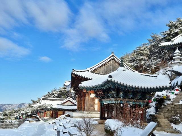 하늘로 향한 석탑 위에도, 전각의 지붕 위에도, 오래된 장독대와 소나무 가지마다 함박눈이 소복이 쌓이며 산사 전체가 고요한 겨울 풍경으로 물든다.