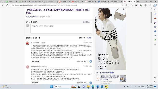 | ▲ 중앙일보 일본어판에 달린 누리꾼 댓글. 3월 28일 밤 10시 40분 기준 384개의 댓글이 달려있다. 일본의 교과서 검정결과에 대한 한국 측의 항의에 대해 한국 내 반일교육을 탓하는 댓글들에 다수의 추천이 누적되어있다. |