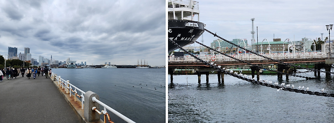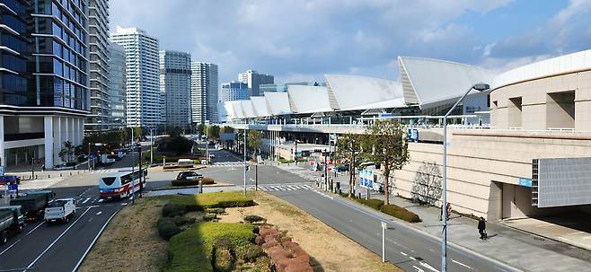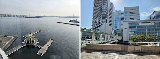 PACIFICO YOKOHAMA 센터 옆에 있는 그랜드 인터콘티넨탈 호텔에서 내려다 본 요코하마 앞바다와 전시장 입구.