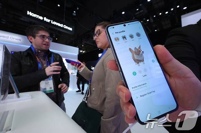 (라스베이거스(미국)=뉴스1) 신웅수 기자 = 세계 최대 IT(정보기술)·가전 전시회 'CES 2025' 개막을 하루 앞둔 6일(현지시간) 미국 네바다주 라스베이거스 컨벤션센터(LVCC)에서 열린 삼성전자 프리 부스 투어에서 취재진이 펫 케어 인공지능(AI)을 체험하고 있다. 2025.1.7/뉴스1