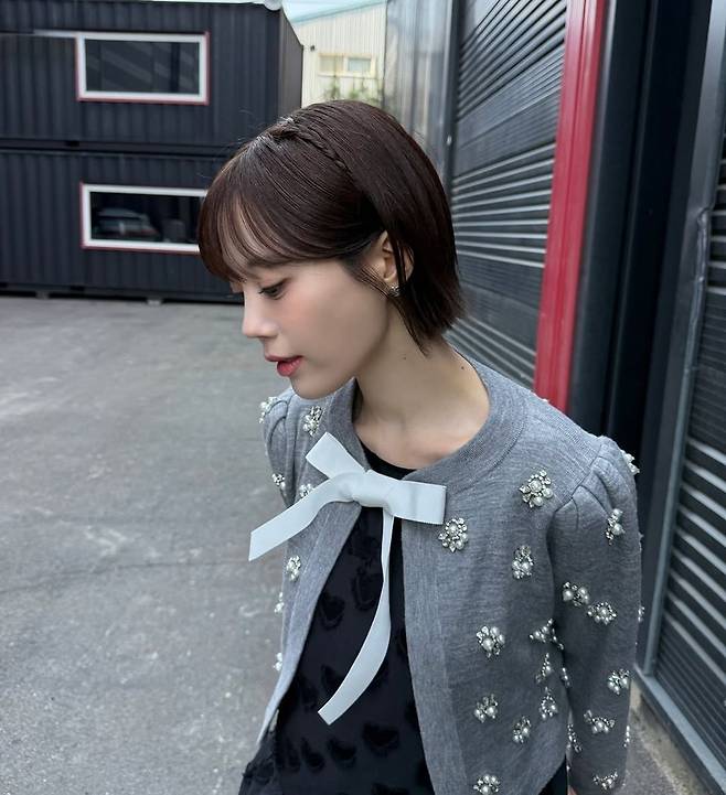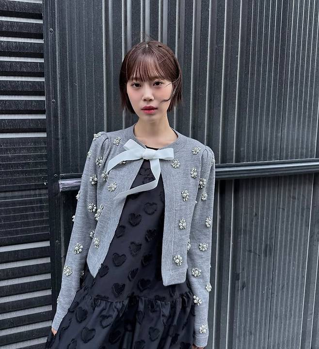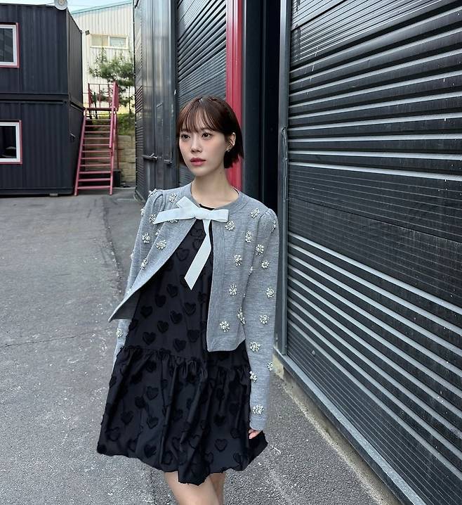 이 룩의 중심은 단연 부드럽고도 차분한 그레이다. 자칫 무심해 보일 수 있는 색조에 리본 디테일이 더해지며 로맨틱한 포인트가 완성됐다. 허영지가 선택한 블랙 미니 드레스는 전체적으로 하트 모양 텍스처가 가미되어 사랑스러움과 우아함을 동시에 품고 있다. 드레스의 실루엣은 루즈하면서도 풍성하게 퍼지는 A라인으로 연출돼, 걸을 때마다 몽환적인 리듬을 만들어낸다.