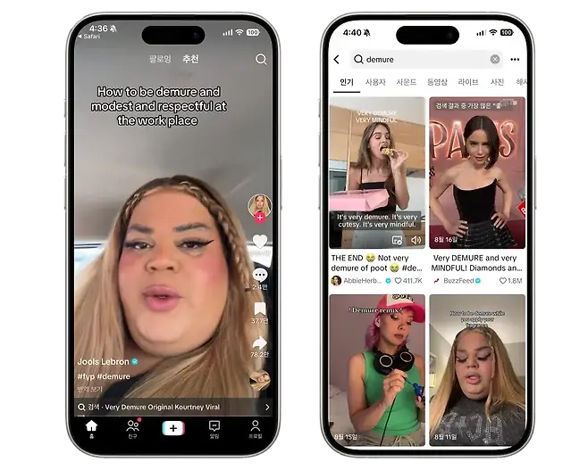 매해 새로운 패션이 뜨고 지며 빠르게 돌고 돌지만, 올해 드뮤어룩만큼 자주 언급되면서도 또 설명하기 애매한 단어가 또 있을까. 솔직히 고백하자면, 나는 아직도 드뮤어가 어떤 뜻인지 정확하게 이해하지 못한다. 이 단어는 올해 8월 틱톡커 줄스 레브론(@joolieannie)에서 시작된다. 직장에서 겸손하고 공손한 태도를 유지하는 방법에 대해 이야기하면서, 자신의 룩을 “very demure, very mindful(매우 정숙하고, 매우 사려깊은)”으로 언급하는데, 이 영상은 2024년 12월 기준 오천사백만이 넘는 조회수를 기록했을 정도로 활발하게 논의되고 있다.