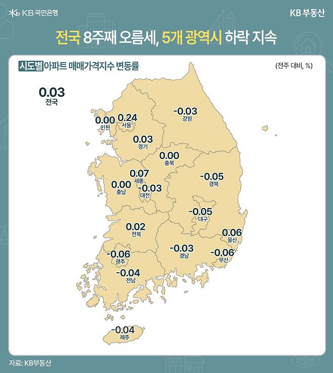 이번 주 전국 아파트 매매가격은 전주 대비 0.03% 상승하며 8주 연속 오름세를 보였습니다. 다만 지난 6월 마지막 주 이후 3주째 상승폭이 줄어드는 모습인데요. 수도권은 0.09%로 비교적 안정적인 흐름을 보였고, 5개 광역시는 -0.04% 하락하며 상승 흐름과는 엇갈리는 양상입니다. 울산을 제외하고 대구, 부산, 광주, 대전은 모두 하락세를 기록했습니다. 세종은 14주 연속 상승하며 여전히 강세를 유지했지만, 그 상승폭 또한 축소되는 분위기입니다.