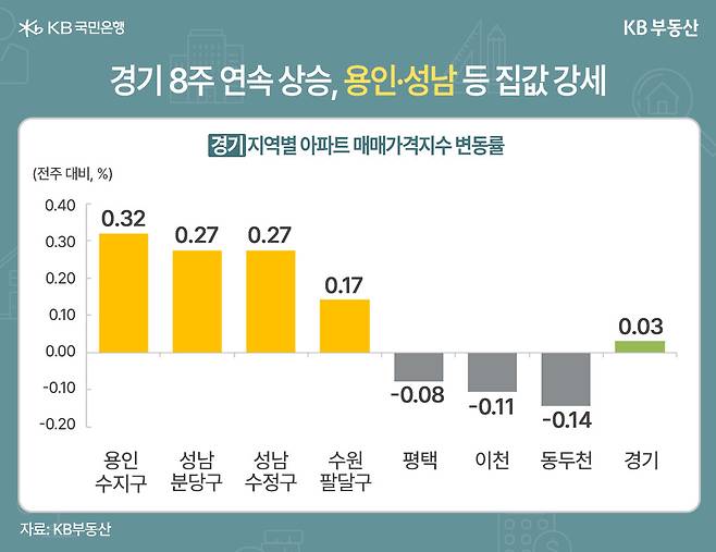 경기 지역 아파트값은 7월 14일 기준 0.03% 상승하며 8주 연속 오름세를 이어갔습니다. 특히 용인시 수지구(0.32%), 성남시 분당·수정구(각 0.27%), 수원 팔달구(0.14%) 등이 강세를 보였습니다. 수도권 남부 교통망 개선과 선호도 높은 학군, 정비사업 추진이 맞물리면서 수요가 유입된 것으로 보입니다.