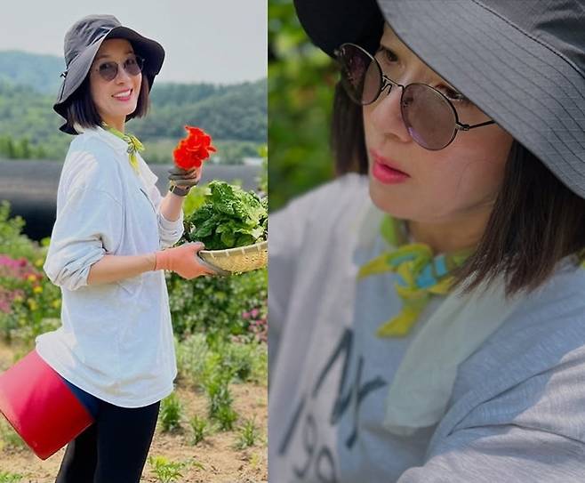 배우 오연수가 채소 텃밭에서도 스타일리시한 워크웨어룩으로 존재감을 발산했다.