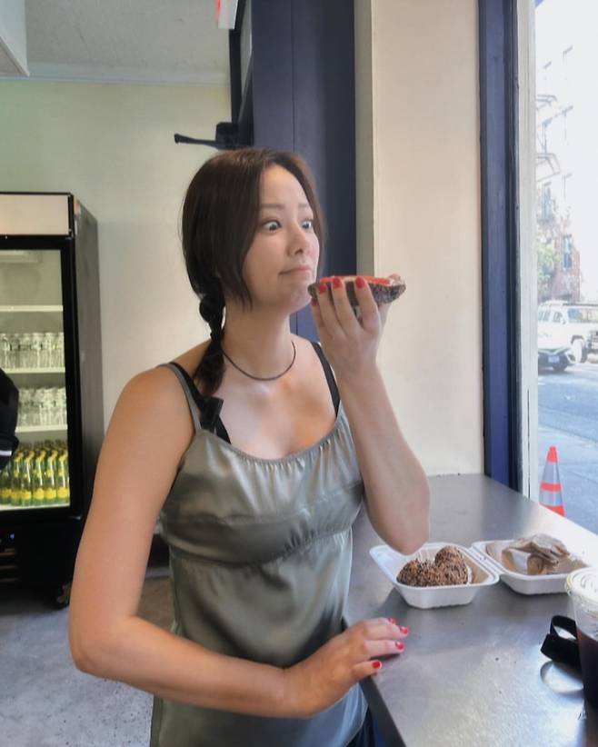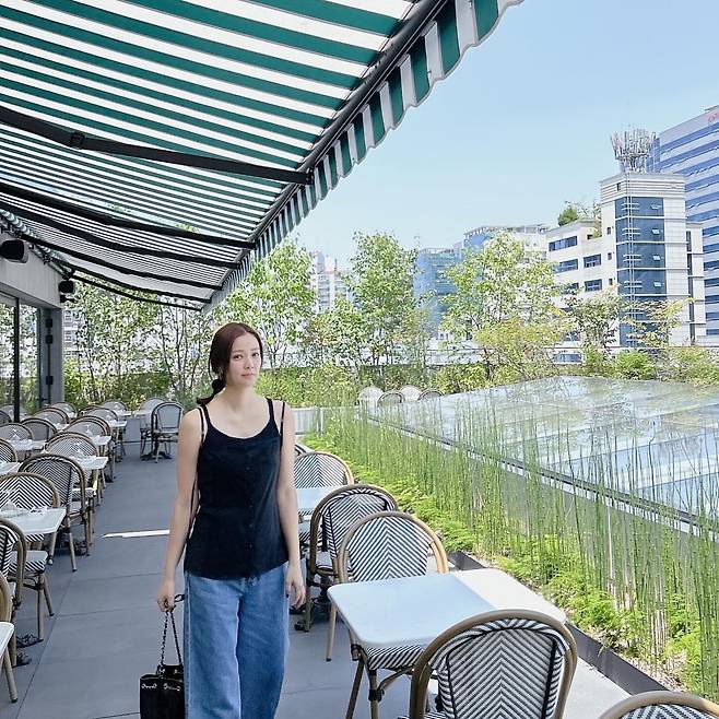 손태영은 네이비 슬리브리스 탑과 데님 팬츠를 매치하여 편안하면서도 세련된 캐주얼 룩을 연출하고 있다. 스트라이프 패턴의 의자가 놓인 테라스 카페에서 촬영된 이 사진에서 그녀는 미니멀한 블랙 체인백을 포인트 아이템으로 활용해 심플함 속에서도 고급스러운 분위기를 자아내고 있다.