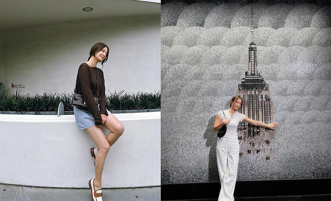 뉴욕의 상징적인 건물을 배경으로 한 올화이트 코디네이션이 인상적이다. 화이트 크롭 탑과 와이드 팬츠의 매치로 깔끔하고 시원한 여름 스타일을 연출하고 있으며, 블랙 숄더백이 전체적인 룩에 포인트를 주어 단조로움을 피하고 있다.