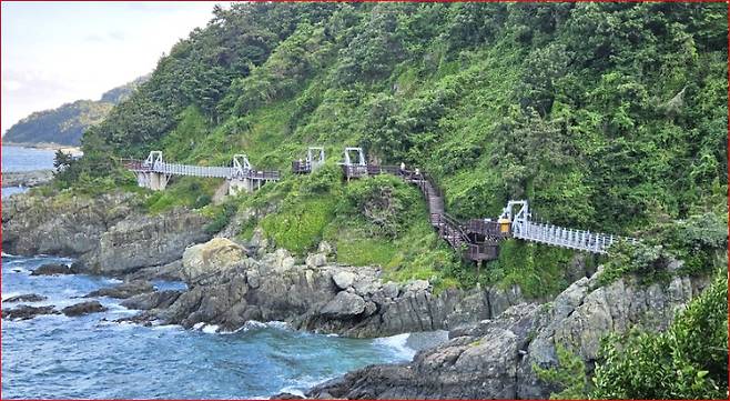 길 위에는 구름다리와 전망대, 바다로 툭 튀어나온 데크길들이 있어, 걸음을 멈추고 바다를 감상하기에 딱 좋습니다. 해식절벽 아래로 쉴 새 없이 밀려드는 파도 소리, 그리고 하늘빛을 머금은 푸른 바다는 걷는 이들의 발걸음을 멈추게 합니다.