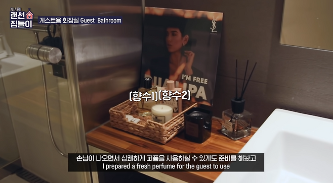 225만명의 구독자를 가진 뷰티 채널 ‘RISABAE’를 운영하는 이사배는 세면대 옆에 좋아하는 가수의 포스터를 뒀다. 포스터 주변에 디퓨저와 바구니를 함께 배치해 고급스러운 분위기를 연출했다.