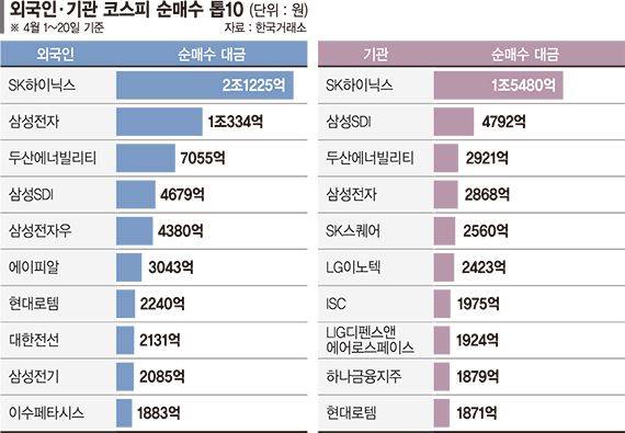 기관 역시 SK하이닉스를 1조5480억원어치 사들이 순매수 1위에 올려놨다. 순매수 2위 삼성SDI(4792억원)의 3배를 웃도는 규모다.