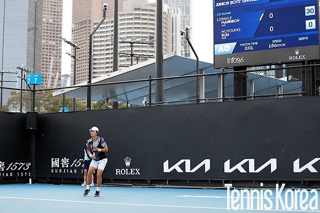 [멜버른=박성진 기자] 노호영(오산TA, 주니어 33위)의 2024년 주니어 호주오픈 도전이 1회전 만에 막을 내렸다. 홈코트의 파블 마린코프(호주, 주니어 20위)에 스트레이트로 패했다. 1세트 퍼스트 서브 정확도가 떨어졌던 것이 결정적인 패인이었다.