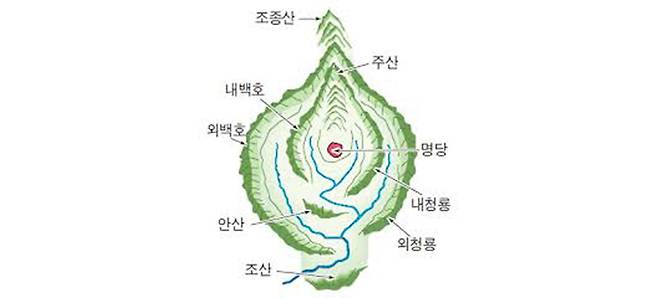 풍수(風水)란 ‘장풍득수(藏風得水)’ 즉, 바람을 갈무리하고 물을 얻는다는 말을 줄인 표현이다. 물을 얻으면 생기가 머물고, 기가 흩어지지 않는다는 것이다. 우리는 자연을 살아 있는 생명체라 생각해 왔다. 건축학자 코야마 히사오(香山壽夫)는 “이상적인 주택, 즉 자기의 생(生)과 대지의 기(氣)가 합일하는 명당을 앉힐 지형을 나타낸 명당도는 완만한 언덕 몇 겹으로 둘러싸이고 남으로 열리며 중심에서 조금 높은 언덕과 용솟음치는 샘을 가진 지형을 나타내고 있다”라며 “그것이 여러 차례 둘러싸여 닫히고, 남쪽의 태양을 향해 열려 입구가 되며, 마주하는 바깥의 산과 이어지는 형태라고 할 수 있다”라고 했다. 결국, 풍수지리는 둘러싸여 있는 평안한 지형인 혈좌(穴座)를 찾는 것이다. 풍수에서는 산맥의 흐름을 땅의 기운이 흐르다 굳어진 것으로 보았다. 이 산맥의 흐름의 용의 움직임으로 간주하고 이를 간룡(看龍) 체계로 보았다. 주산(主山)은 부모이고 혈(穴)은 자식 즉, 태(胎 : 복중의 태아)인데 앞서 말한 포(包)의 형상처럼 감싸는 형상이라는 공통점이 있다.