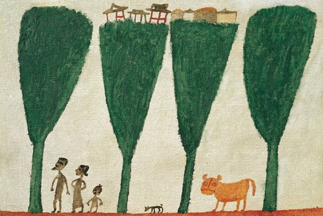 이 두 이미지가 겹치면서 서로의 의미가 명확해졌다. 가로수 그림은 가로수 나무 아래 세 가족이 앞서 걸어가고 뒤를 따라 강아지와 황소가 뒤따라가는 예닐곱 채의 집들이 가로수 나무 위에 얹어져 있다. 한자 ‘집(集)’의 원형인 ‘집(雧)’자는 꼬리 짧은 새(隹) 세 마리(많다는 의미)가 나무 위에 모여 있는 모습이다. 많은 새가 나무(땅)에 의지해서 ‘따로 또 같이’의 삶을 살아가는 모습이다. 장욱진의 그림 <가로수>가 마치 집(雧)이라는 글자의 ‘꼬리 짧은 새’를 사람이 사는 집으로 치환해 둔 것처럼 보였다. 이 두 그림이 보여주는 것은 새들도 사람도 어디에 의지하여서 모여 산다는 것이다.