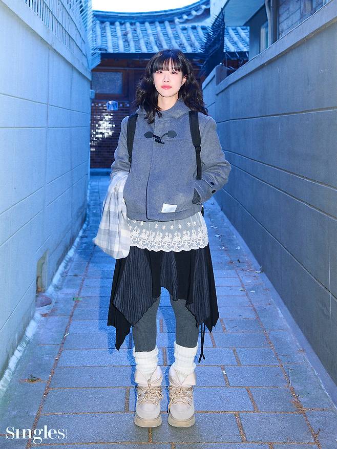 아우터는 ROCCI ROCCI, 카디건은 BOCBOK, 스커트는 김아홉, 슈즈는 MARDI MERCREDI, 머플러는 GOBI.