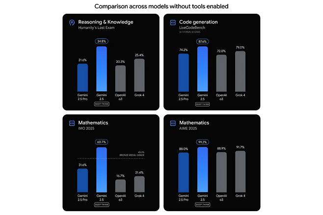 제미나이 2.5 딥 싱크가 코딩, 수학 인문학, 과학 등 여러 벤치마크 평가에서 경쟁 모델보다 우수한 성능을 보였다는 게 구글 측의 설명이다.