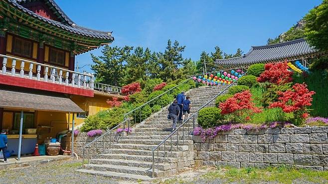 이 구름다리는 붉은색으로 설계돼 멀리서도 도드라지며 두 봉우리를 잇는 곡선형 라인 자체가 이미 사진의 구도가 된다. 전망대에 오르면 숲 아래로 드러나는 능선과 멀리 펼쳐지는 바다, 마을의 지형이 한눈에 들어온다.