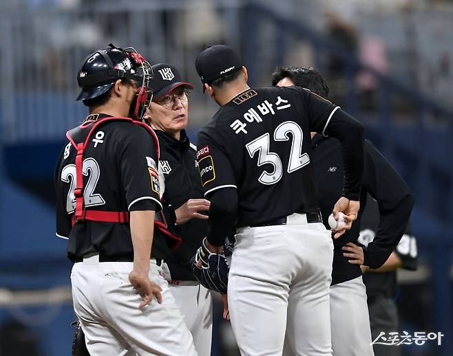 16일 서울 고척스카이돔에서 ‘2024 신한은행 SOL뱅크 KBO리그’ KT 위즈와 키움 히어로즈 경기가 열렸다. 3회말 1사 KT 이강철 감독이 마운드에 올라 선발 쿠에바스와 이야기하고 있다.