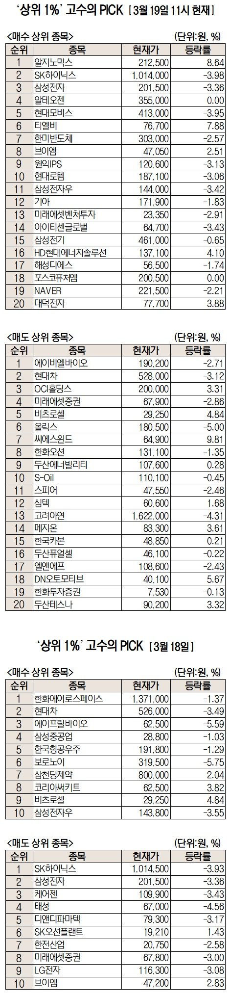 미래에셋증권에서 거래하는 고수익 투자자들이 19일 오전 알지노믹스(476830), SK하이닉스(000660), 삼성전자(005930) 등을 가장 많이 순매수한 것으로 집계됐다.