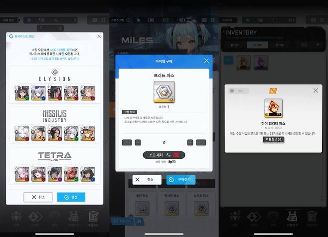 그리고 SSR 등급에는 무려 12명의 니케가 포진되어 있습니다. 하지만 내게 필요한 니케를 선별 수급할 방법이 없습니다. 40연 뽑기 이후에 설정 가능한 ‘위시리스트’는 범위를 좁혀주는데 그치고, 뽑기를 통해 얻은 마일리지로는 니케의 한계돌파에 필요한 ‘피스’만 살 수 있습니다. SSR 등급 니케를 확정적으로 가질 수 있는 ‘하이 퀄리티 피스’조차 어떤 니케가 나올 지는 무작위죠.