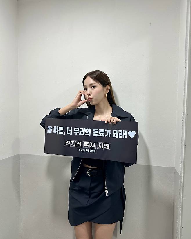 블랙 재킷과 미니스커트로 구성된 정장 세트로 프로페셔널한 매력을 발산하고 있다. 허리 벨트로 실루엣을 강조하며, 깔끔한 헤어스타일과 함께 세련된 비즈니스 룩을 연출하고 있다. 한국어가 적힌 포스터를 들고 있어 공식 행사 참석 시의 모습으로 보인다.