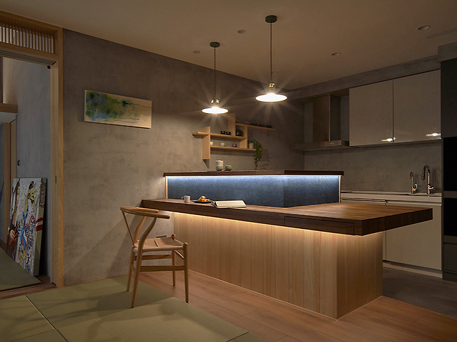 일본식 판전을 가정에 도입한 주방 공간이 특별하다. 일반적인 개방형 아일랜드 바와 달리 돌봄의 자세로 관심을 표현하는 판전의 의미를 담았다. 일자형 흰색 피아노 도장 주방가구와 조화를 이루며, 식물 남염 화지를 목재 판대에 콜라주해 빛과 그림자의 점층적 아름다움을 연출했다.