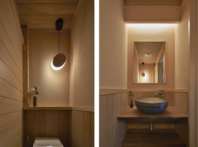 원래 주욕실과 손님용 화장실의 크기를 바꿔 주욕실에 큰 면적을 양보했다. 손님용 화장실은 일본 주택에서 흔히 볼 수 있는 형태를 이어받아 공간을 둘로 나누어 한쪽은 샤워실, 다른 쪽은 전통적인 긴 형태의 화장실로 구성했다.