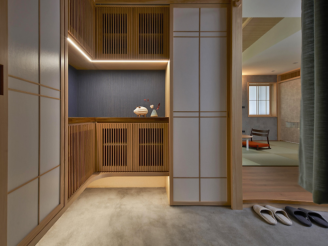 한 25평 아파트에서 만난 이 집은 일본 전통 건축의 정수를 현대적으로 해석한 놀라운 공간이다. 입구부터 범상치 않다. 일반적인 현관과는 달리 전통 일본식 도마 개념을 도입해 명확한 방향성을 가진 복도를 만들어냈다. L자형으로 꺾이는 입구 옆으로는 장애자문을 설치해 충분한 수납공간을 확보했고, 심지어 전자 옷장까지 숨겨두었다.