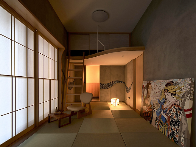 내측 미닫이문에는 명경을 세심하게 부착해 요가 자세 조정을 돕고, 작은 다락을 반사시켜 공간감을 확대했다. 거실에서 객실로 이어지는 긴 형태의 집은 어떤 차단도 없어 연속적인 채광을 얻을 수 있다.