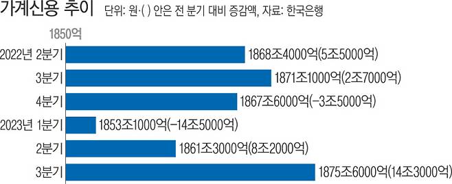 한국은행이 21일 발표한 ‘2023년 3분기 가계신용(잠정)’ 통계를 보면 지난 9월 말 기준 가계신용 잔액은 1875조6000억원으로 2분기 말보다 14조3000억원(0.8%) 늘었다. 가계신용은 가계가 은행·보험사·대부업체·공적 금융기관 등에서 받은 대출에 결제 전 카드 사용 금액(판매신용)까지 더한 ‘포괄적 가계빚’을 말한다.