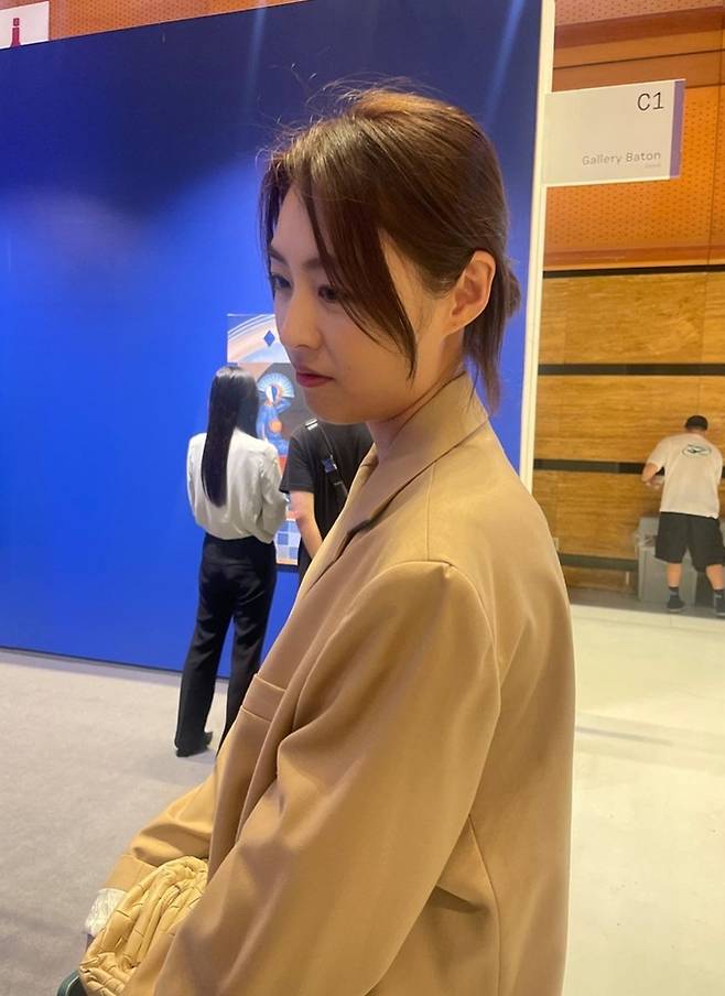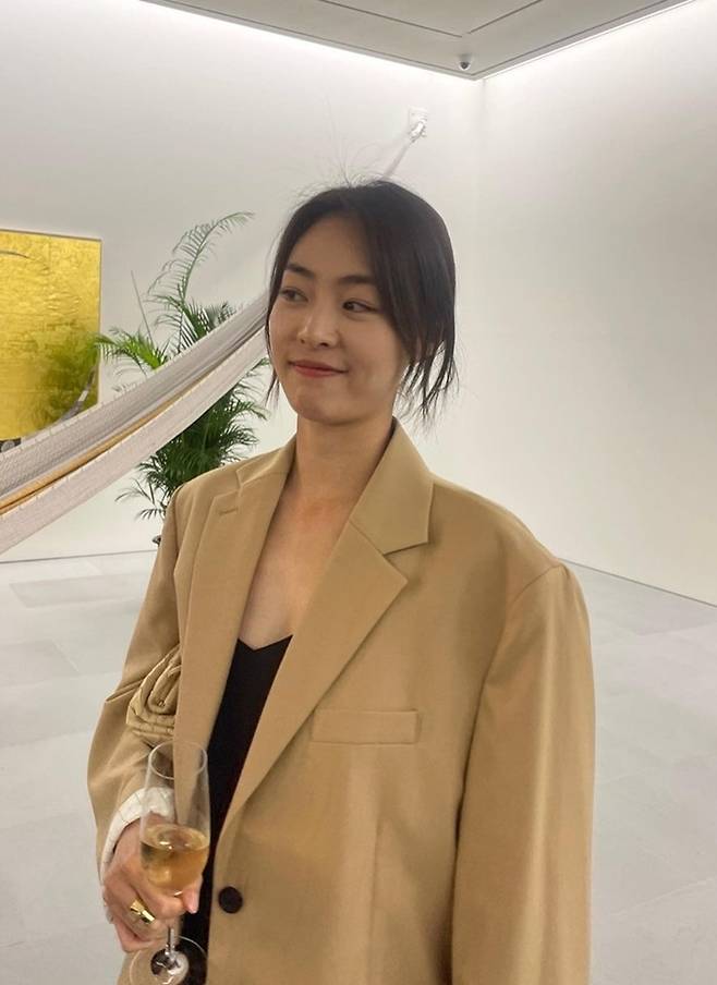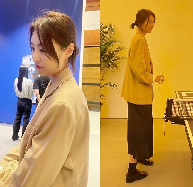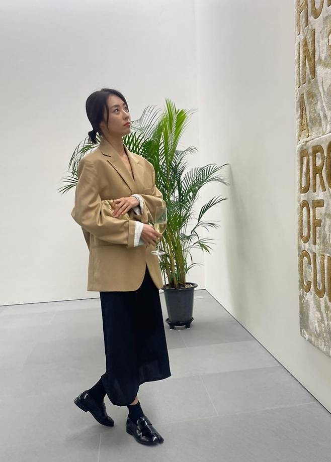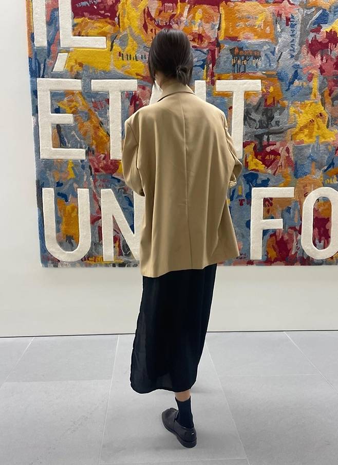 공개한 사진에서 이연희는 짧은 꽁지 머리에 블랙 스커트와 오버핏 베이지 재킷을 착용한 전시회 나들이룩으로 눈길을 사로잡았다.