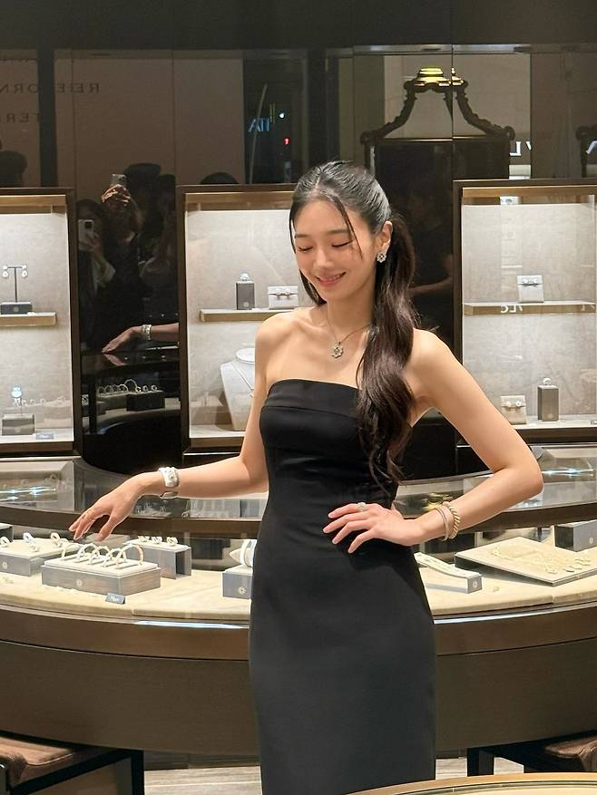 첫눈에 시선을 끄는 건 박규영의 우아한 블랙 스트랩리스 드레스예요.