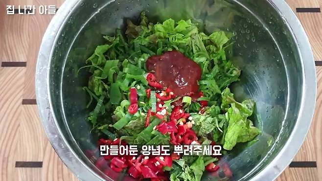 잘 썰어진 상추에 준비한 양념과 썰어둔 야채를 넣고 잘 섞어주세요.
