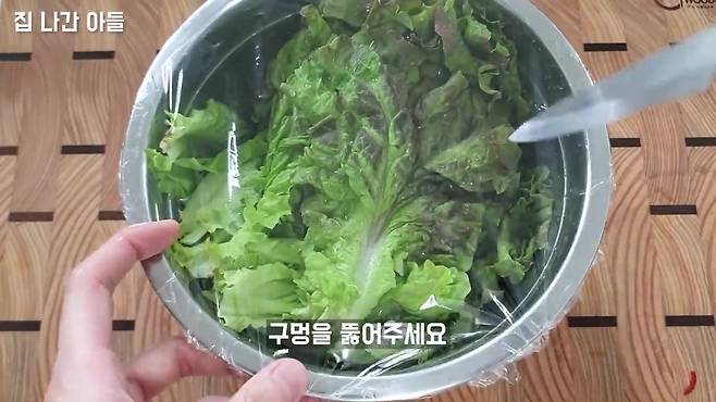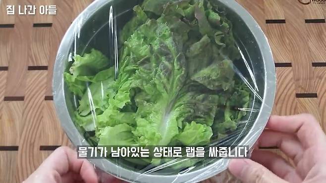 씻은 상추는 물기가 남아 있는 상태로 랩을 씌워줍니다.