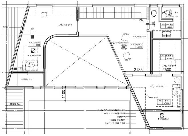 2층 도면도 정말 특별하죠? 2층에는 아이방, 안방, 욕실, 작은 거실이 있어요. 아이방에는 천장이 있어서 별도 보고 구름도 볼 수 있어요. 아이방은 거의 ㄱ자 구조입니다. 구조가 재미있지만 그만큼 연출하기도 쉽지 않아서 3년이 지난 지금도 미완성입니다. 입구에서 안쪽으로 들어오는 벽체에 라운딩이 더 넓어 보이는 효과를 줍니다.