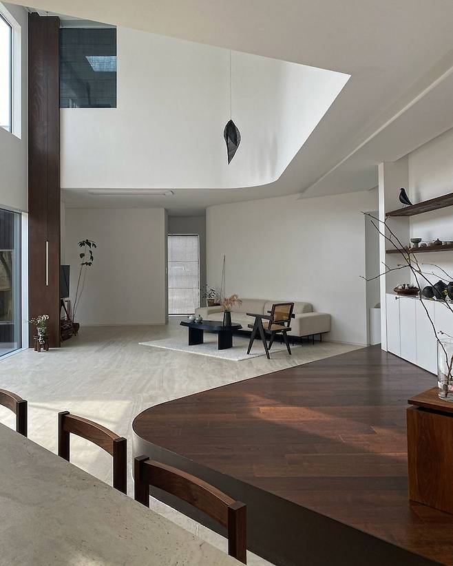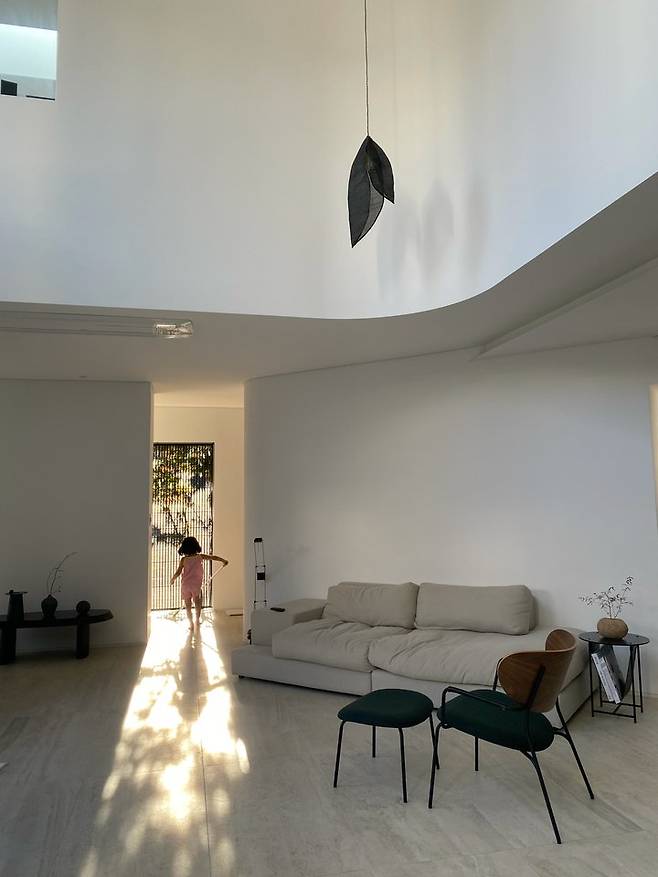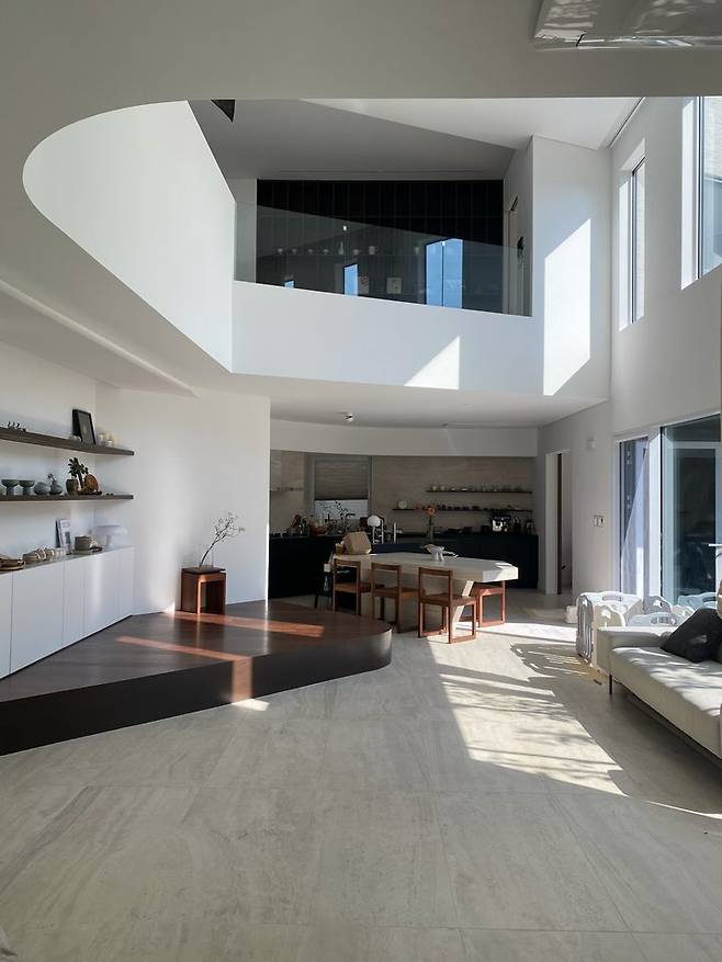 저희 집은 공간이 네모 반듯한 곳이 화장실 팬트리 현관 빼고는 없습니다. 이런 점이 어느 각도에서 찍어도 재미를 주는 요소가 되었습니다. 라운딩 된 구조가 다양한 모양의 면을 만들어 공간을 더욱 풍부하게 만들어 줍니다. 보이드 공간은 높이가 약 7미터 정도 되는데 높은 천고는 웅장함을 줍니다.