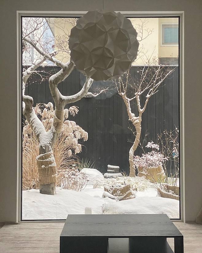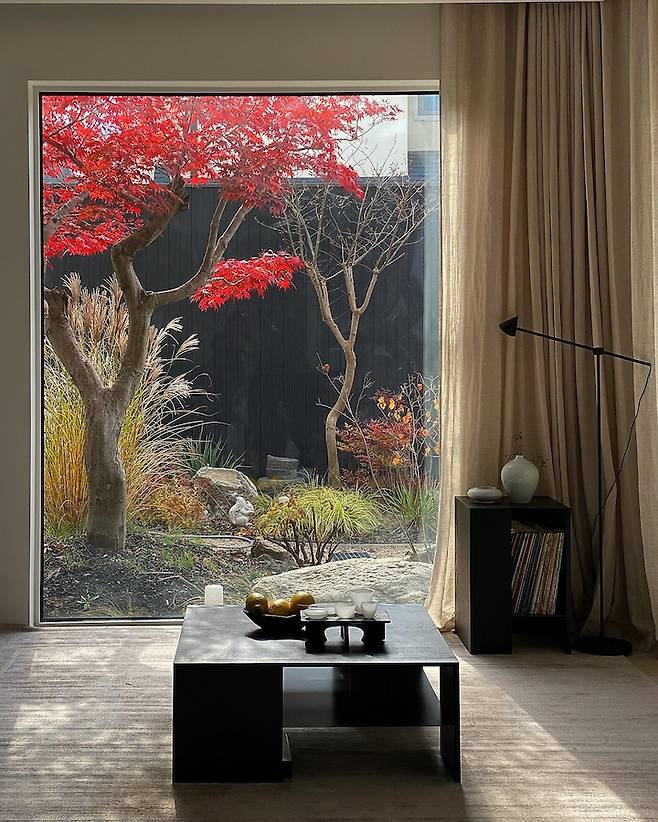 집에서 가장 사랑하는 공간입니다. 차를 마시고 일을 하고 가족과 식사도 하는 멀티룸인 셈이지요. 커다란 갤러리창이 계절마다 다른 그림을 만들어 줍니다. 가을에 붉게 물든 단풍이 아름답고 고즈넉한 차경을 만들어 주어요. 주택살이의 큰 행복 중 한 부분입니다. 겨울에 눈 오는 모습이 영화를 보는 것 같은 착각이 듭니다.