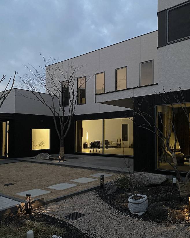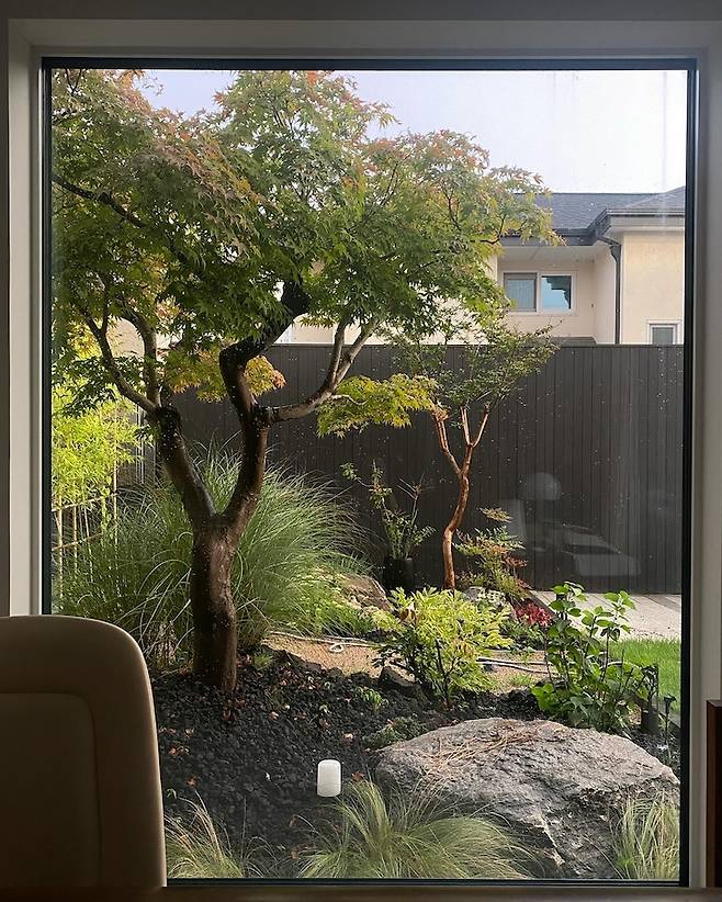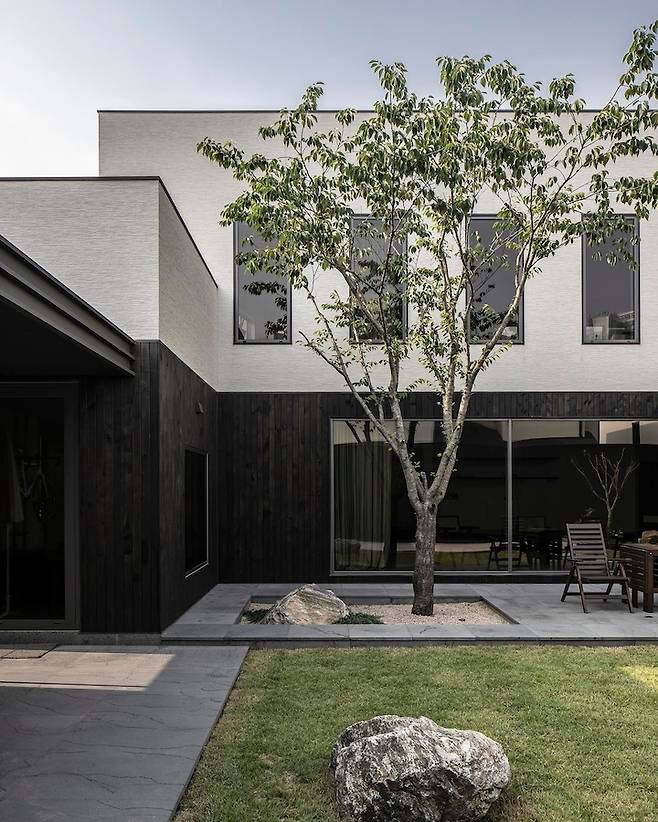 큰 돌과 제법 키가 큰 왕벚꽃 나무를 왼쪽에 두어 삭막할 수 있는 모던함에 주택의 개성과 스타일을 부여했어요. 정원의 구조, 식물의 선택, 돌과 나무의 조합 등은 주거자의 취향과 가치관을 반영하며, 주택을 더욱 독특하게 만듭니다.