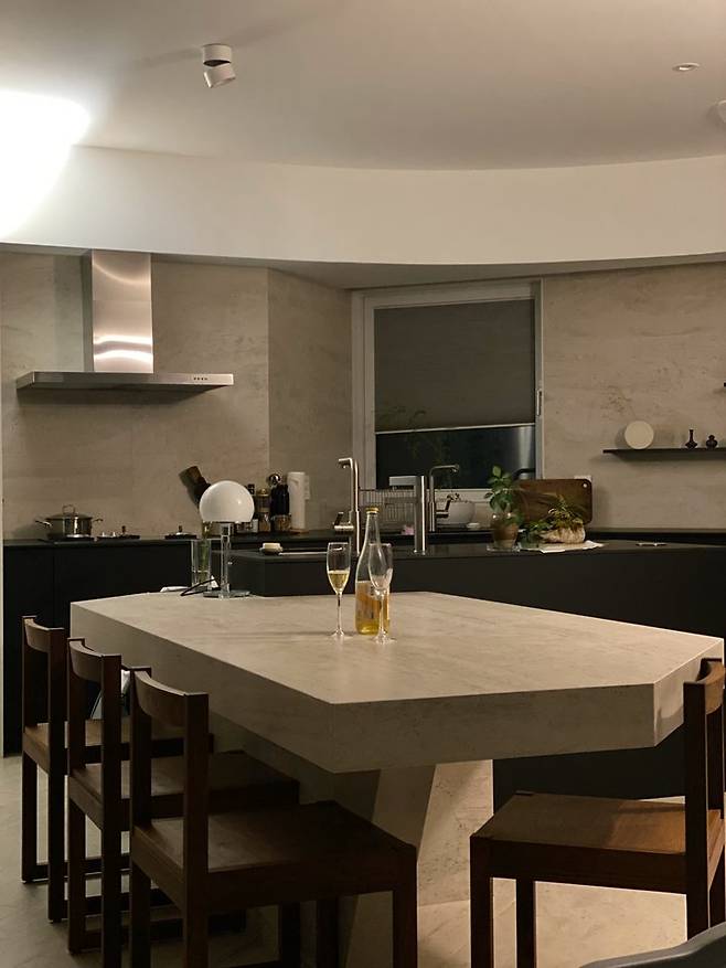 검정 싱크대에서 이어지는 비정형 모양의 아일랜드 식탁이 모던함을 극대화해 줍니다. 의자는 우리 집 목재 전체 톤과 맞춰서 기민석 작가님께 의뢰하여 제작했어요.