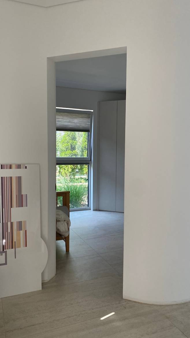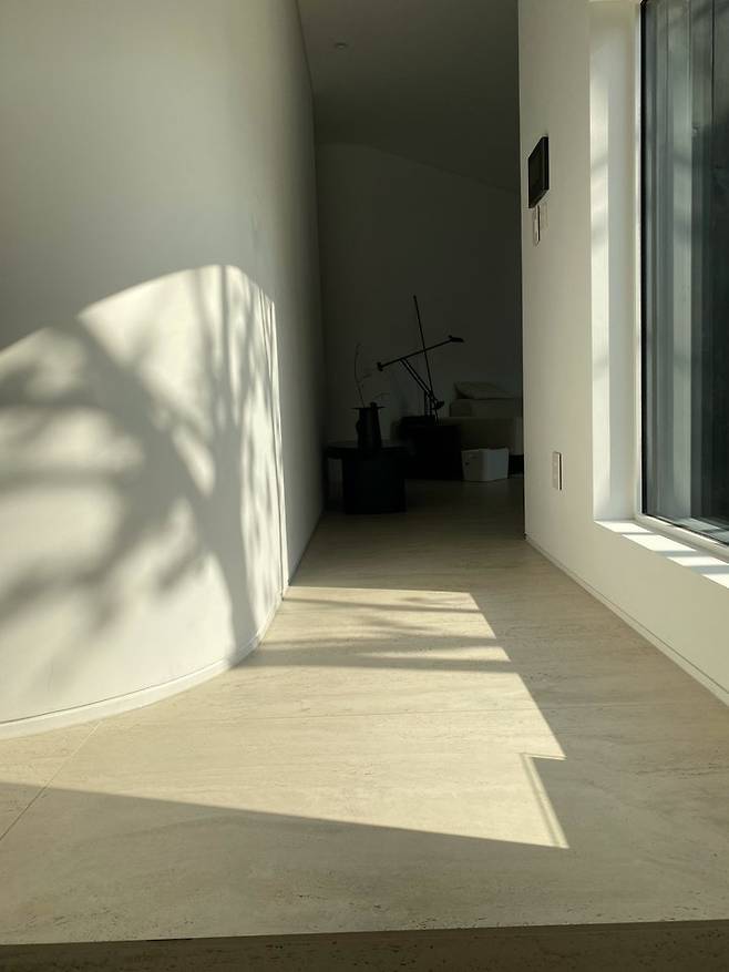 현관문을 열고 들어오면 라운딩 된 벽과 트라버틴 타일이 이어집니다. 오른쪽으로는 사람 키만큼 큰 통창이 동쪽을 향해 있어요. 아침에는 해가 깊게 현관으로 들어옵니다.