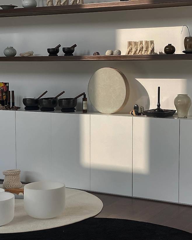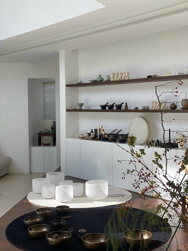 주말에는 싱잉볼 명상 수업이 있기 때문에 크리스탈 싱잉볼과 히말라야 싱잉볼이 늘 대청마루에 연주하기 쉽게 진열되어 있어요. 선반에는 체험할 수 있는 히말라야 싱잉볼과 시향과 판매 가능한 한옥 향수가 있습니다. 고재 오브제들 몇 가지와 연출하니 악기와 향수도 멋진 오브제 같아요.