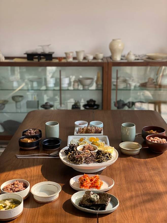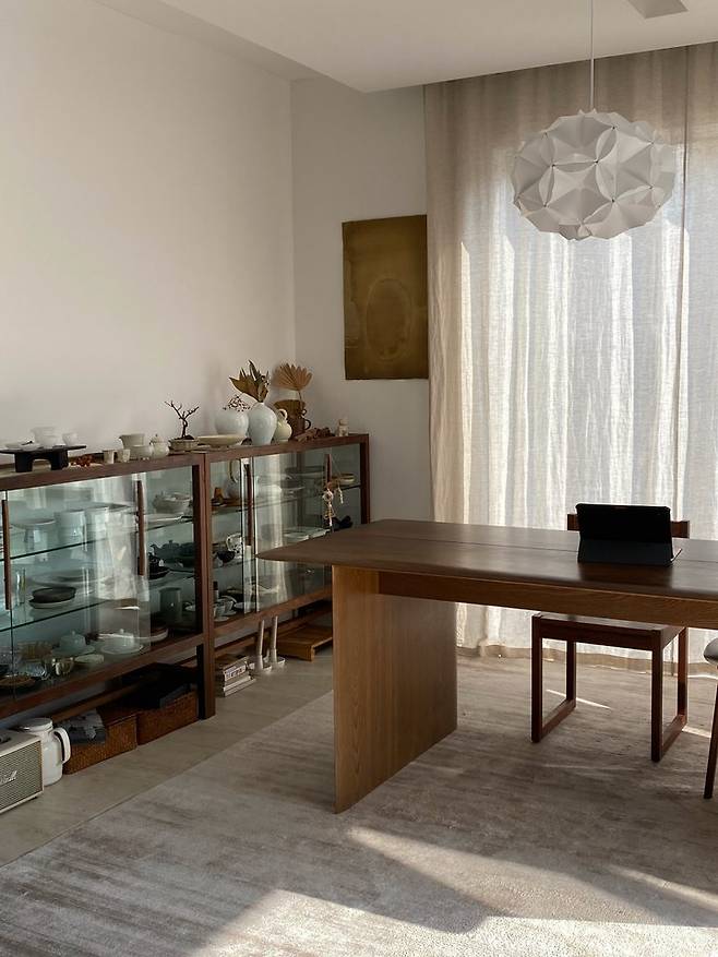 이 공간은 찾아온 손님들과 차명상을 하고 차담을 나누고 분위기를 내고 싶은 날은 가족들과 근사한 식사를 하는 곳입니다. 벽 한쪽에 있는 수납장은 결혼생활 동안 모아온 기물들을 정리해 놓았어요.