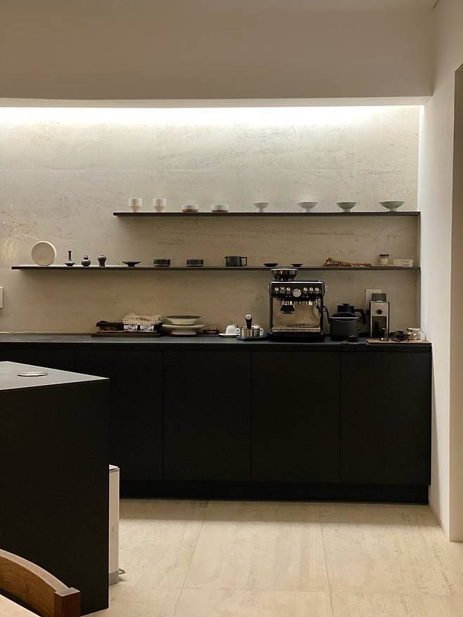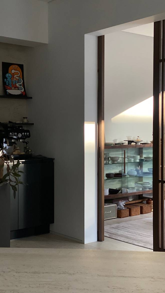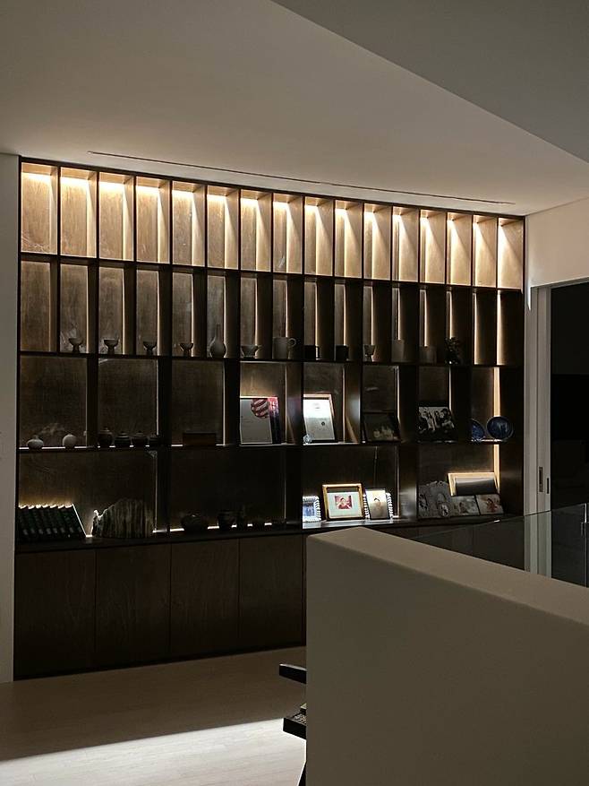 쇼룸 같은 느낌을 내기 위해서 프레임만 나무고 유리로 제작했습니다. 이곳에 손님이 오면 시간 가는 줄 모르고 대화가 이어져요. 그래서 원래 계획했던 시간들 보다 항상 더 오래 머물다 가십니다. 차 마시는 도구 등 오브제를 효과적으로 보관하고 진열할 수 있게 쇼케이스 같은 수납장을 제작했어요.