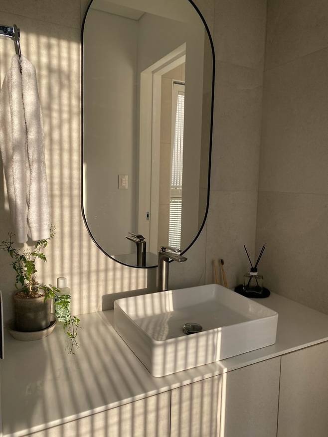 이곳도 비누만 있습니다. 물건은 많으면 정리해야 하지만 없으면 노력 없이 깔끔하게 유지되어 너무 좋아요. 미니멀의 가장 큰 미덕 중 하나인 것 같아요.