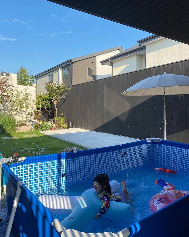 여름에는 간이 수영장을 펼치고 아이와 물놀이를 즐깁니다.