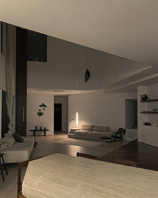 갤러리 같은 집을 소망했기 때문에 거실에서 바랬던 또 다른 로망 중 하나는 높은 천고였어요. 답답함보다는 탁 트인 공간을 원했기 때문에 7미터의 천고 6미터의 통창을 만들었습니다. 아침부터 해가 지기까지 빛의 각도와 모양이 다르게 들어와서 아름답습니다. 지루할 틈이 없어요.
